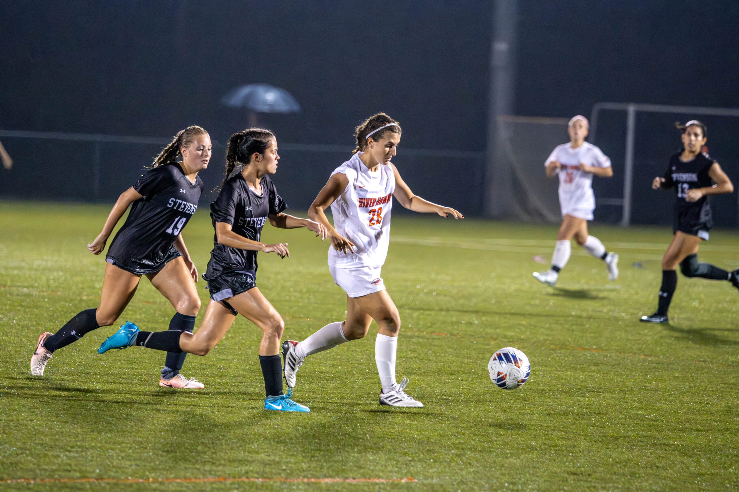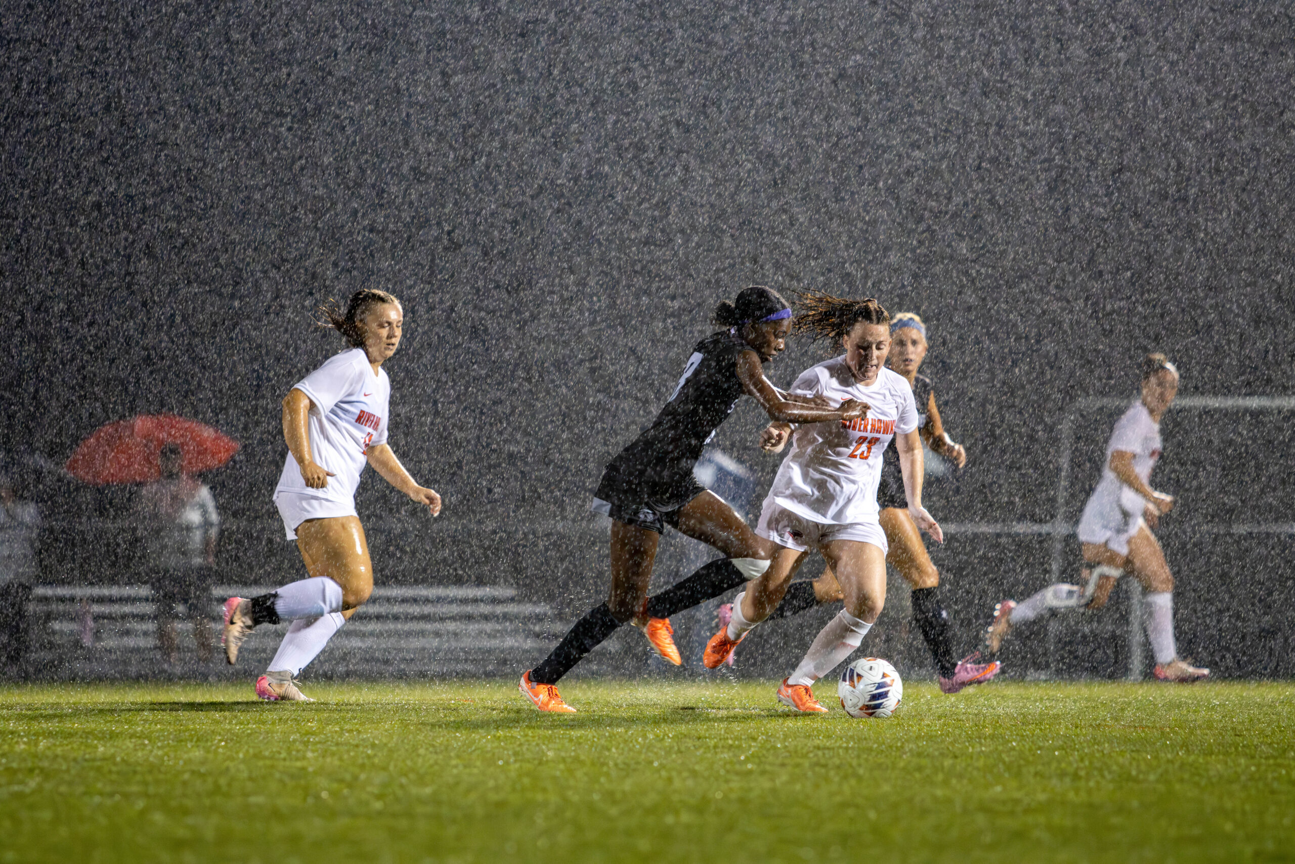 The rains heaved on from kickoff until the full whistle, posing tough conditions for the River Hawks, who failed to find the goal in open play despite recording 22 shots, with seven shots on goal.