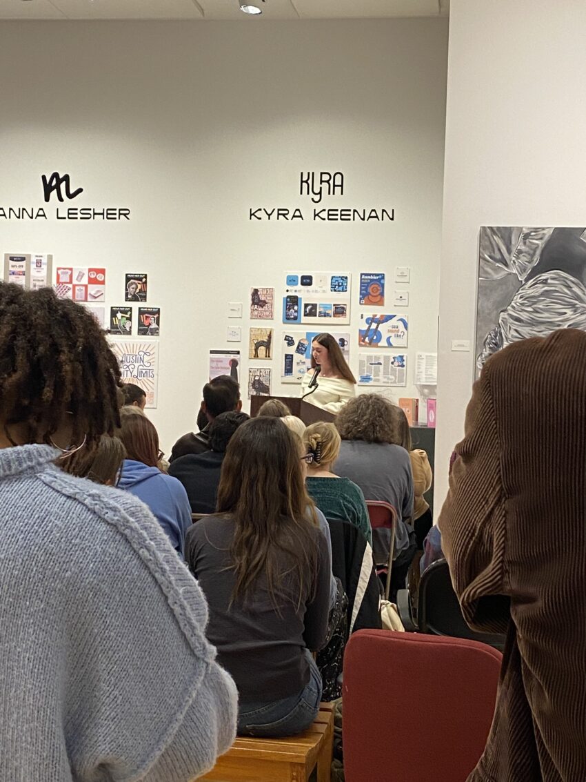 This event featured seven graduating creative writing students, providing each of them with the opportunity to share some of the work they have produced over the time they’ve spent in the program. Seven students also meant the gallery was filled nearly to the brim, with friends, family, and other students there to show their support.